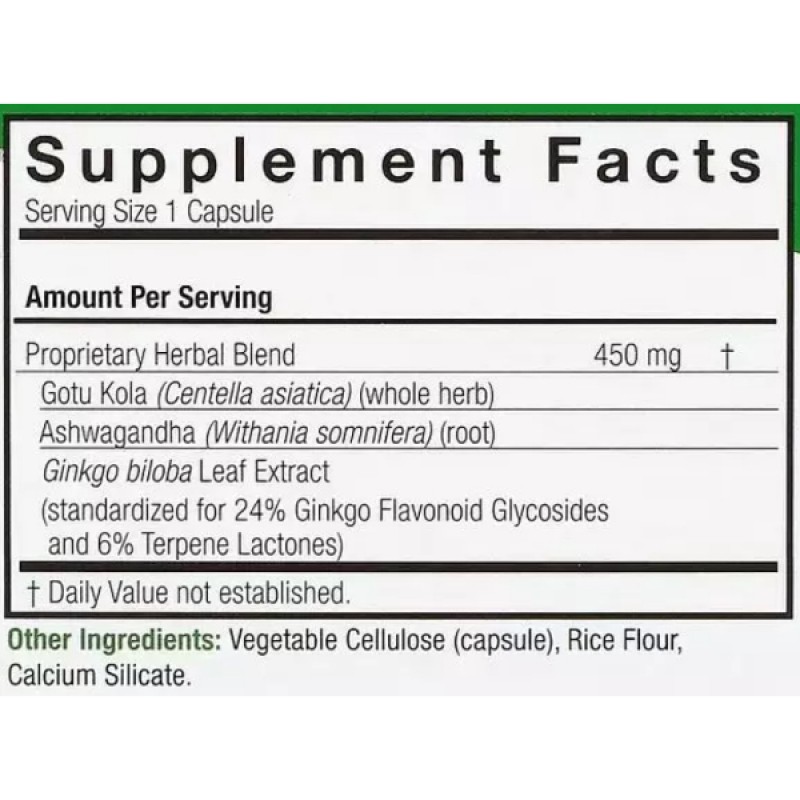 Комплекс трав для работы мозга Nature's Answer "Brainstorm 2" основан на таких травах как: готу кола (центелла азиатская) или "трава памяти", корень Ашваганда и экстракт листьев гинкго билоба. Сбор этих трав является незаменимым питательным веществом для поддержания центральной нервной системы. Кроме того она так же служит отличным заживляющим средством, которое препятствует образованию рубцов, обладает болеутоляющим и мягким мочегонным эффектом.