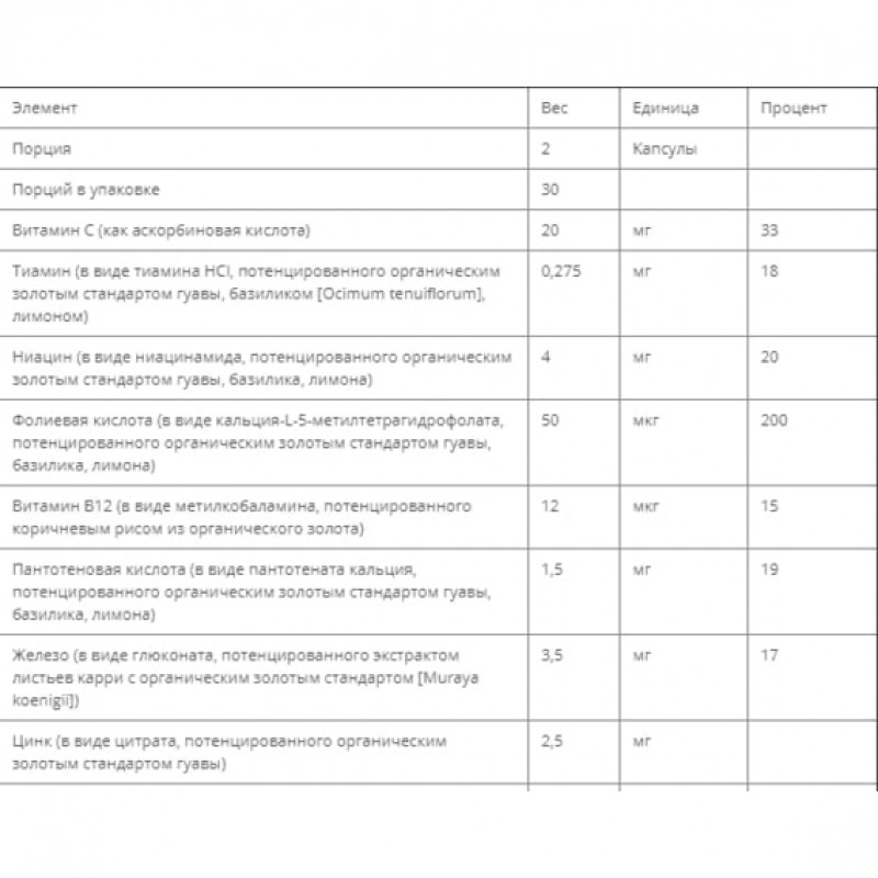 растительная целлюлоза, микрокристаллическая целлюлоза, диоксид кремния, стеарат магния, гуаваа, святой базилик, коричневый рис и вода