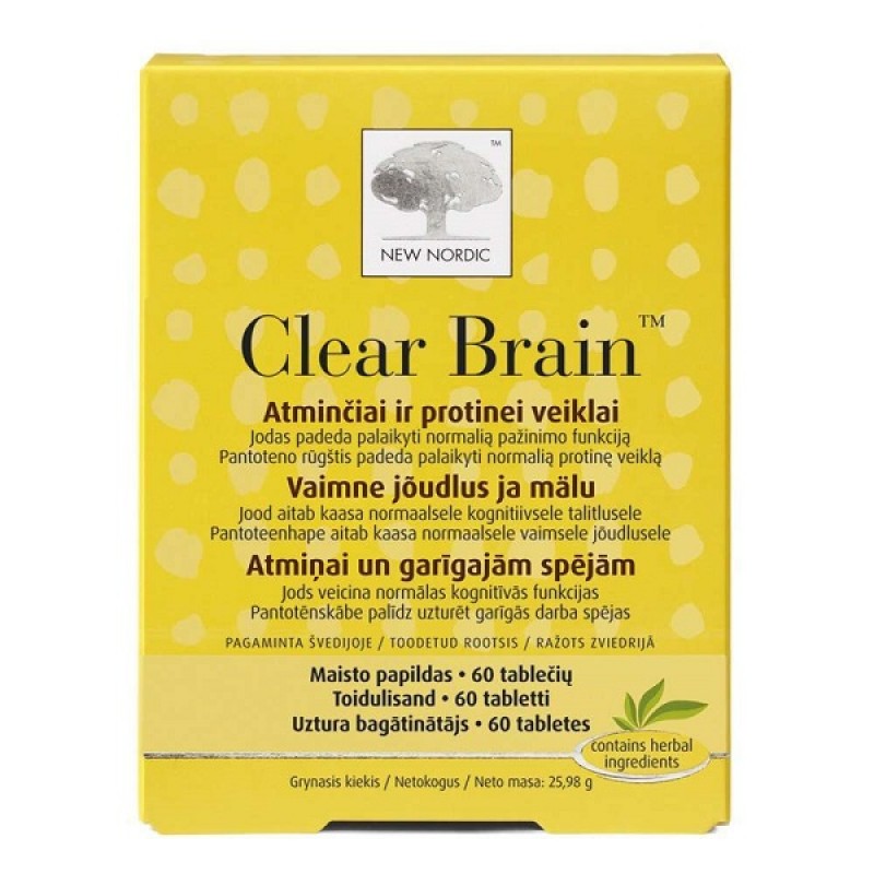 Ученые скандинавской компании «New Nordic» создали новый продукт для питания мозга — таблетки Clear Brain, произведенные из растительных экстрактов, витаминов группы В и йода. Таблетки предназначены для поддержки нормальной мозговой деятельности и укрепления памяти. Таблетки могут принимать как молодые люди, так и люди старшего возраста. Содержащиеся в таблетках Clear Brain биологически активные вещества помогают поддерживать нормальную познавательную функцию, умственную активность и обеспечивают правильную работу нервной системы в целом. Это очень помогает в ситуации, когда в течение короткого периода времени необходимо усвоить или обработать максимальное количество информации.
