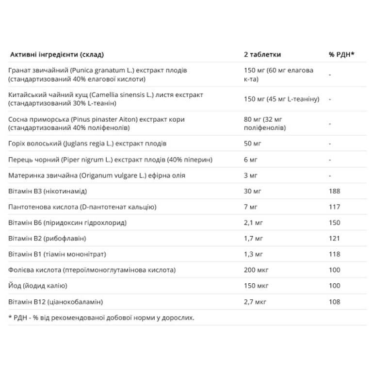 - Плодов граната (Punica granatum L.) – содержит 40% эллаговой кислоты. Является очень сильным антиоксидантом. Поддерживает и улучшает маркеры вербальной и зрительной памяти.