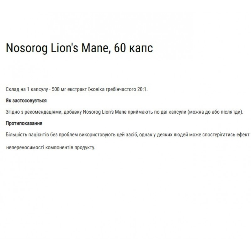 Nosorog Lion's Mane представленный на сайте – это продукт при изготовлении которого используются грибы, выращенные в специальных условиях с применением эффективных технологий. Сырье упаковывается прямо на предприятии где она выращивается что позволяет сохранить все полезные свойства грибов. В банке Nosorog Lion's Mane содержится 60 капсул в состав которых входят мицелы, зачатки, плодовые тела ежовика и все внеклеточные природные соединения.