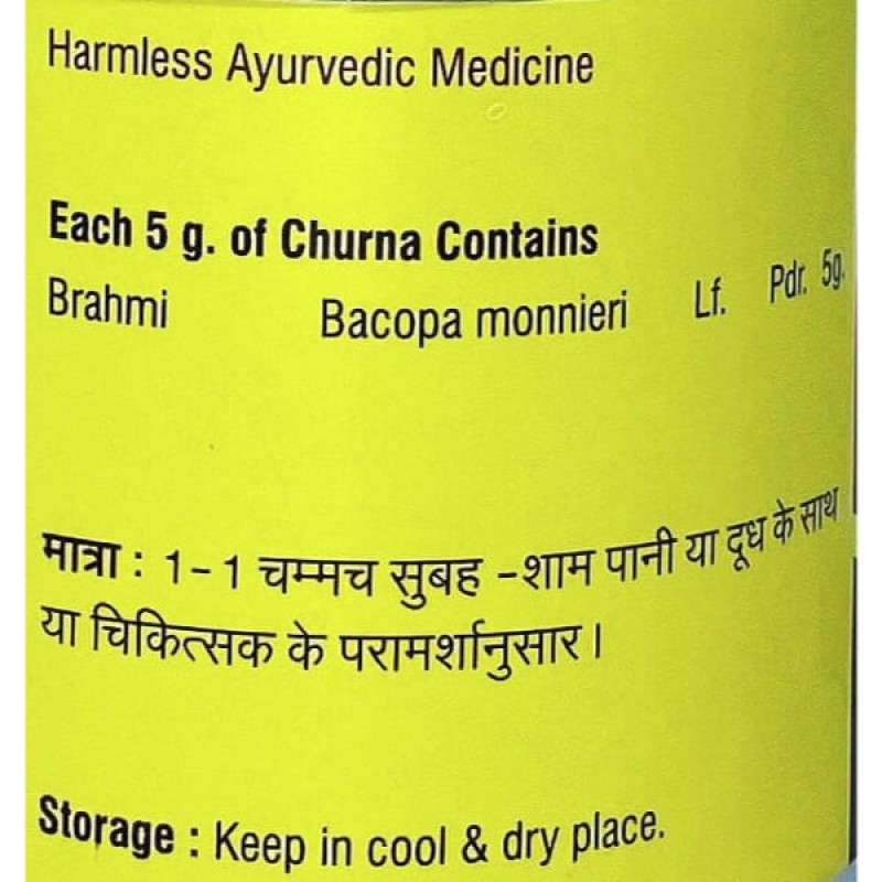 Брахми Чурна (Брами) действует как успокаивающее средство. Используется при неврозах, бессоннице, гиперактивности у детей, эмоциональном перевозбуждении и больших умственных нагрузках. Способствует нормализации правильного мозгового кровообращения. Благодаря чему прекращаются хронические головные боли, уменьшаются спазмы сосудов мозга, останавливается выпадение волос и появление ранней седины.
