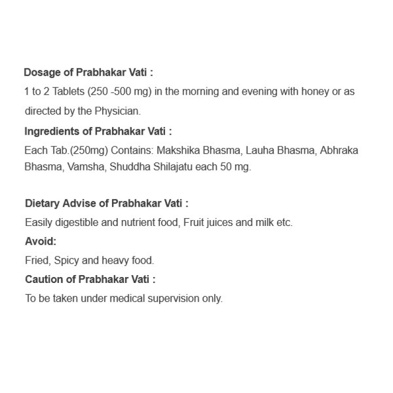 Prabhakar Vati Dabur (Прабхакар Вати Дабур) применяется в аюрведе при всех видах заболеваний сердца. Этот препарат питает ткани организма и обеспечивает силу сердечной мышце. Непрерывное применение этого препарата обеспечивает поддержку для сердца, легких и нервов. Это также полезно при нерегулярном сердцебиении, одышке, боли в груди и боли в области сердца, возникающие в результате анемии. Постоянное применение успокаивает мозг и помогает в крепком сне. Зачастую применяется как сердечный тоник. Может выступать в качестве сопроводительного средства при заболеваниях сердца.
