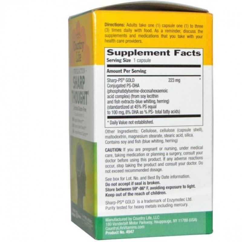 Shapp Thought от Country Life – это специальный комплекс для поддержания Вашей мозговой деятельности, нервных импульсов и памяти. Главными составляющими являются специальный конъюгированный комплекс фосфатидилсерина (PS) и докозагексаеновая кислота (DHA) из омега-3. Именно в этой форме фосфатидилсерин находится в самом главном органе жизнедеятельности - в мозге.