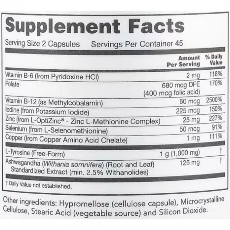 С L-тирозином и йодом, двумя составляющими питательными веществами секрета щитовидной железы, в сочетании со специальными витаминами группы В, цинком, селеном и другими микроэлементами эта формула представляет собой комплексную пищевую добавку для поддержки здоровой функции щитовидной железы. Также в качестве дополнения к питательному компоненту этой формулы были добавлены экстракты гуггула и ашвагандхи.