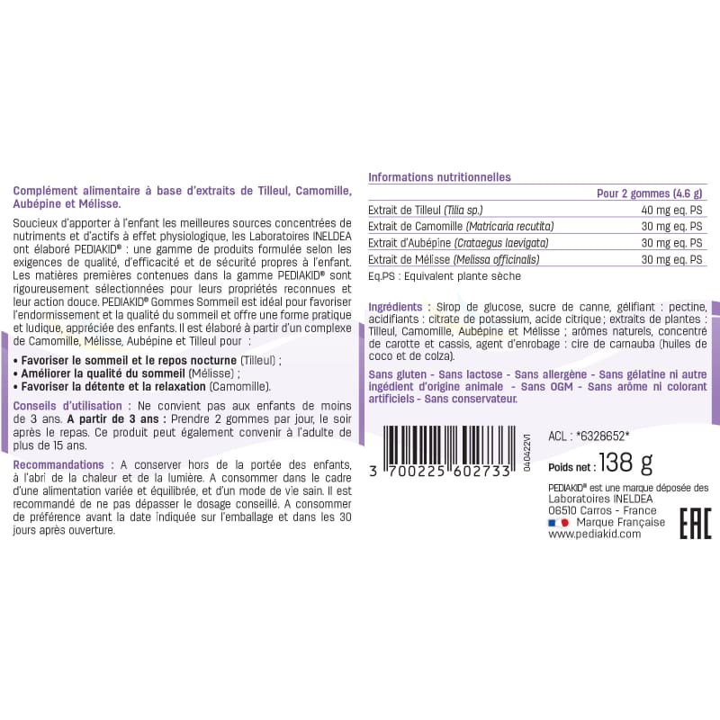 Медвежуйки сон PEDIAKID® сочетают в себе растительные экстракты, тщательно отобранные благодаря их признанным свойствам и мягкому действию, способствующим сну и ночному отдыху (липа), улучшают качество сна (мелисса, ромашка, боярышник) и способствуют успокоению и расслаблению (ромашка).