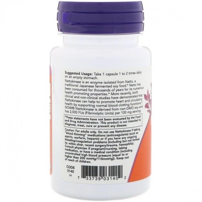 Внимание: только для взрослых. Не принимайте наттокиназу, если вы принимаете препараты для разжижения крови (антикоагулянты) (например аспирин, варфарин, гепарин) или у вас есть текущие проблемы с кровотечением/коагуляцией (включая, без ограничения, активную язву, недавнюю операцию/травму, гемофилию). Проконсультируйтесь с врачом, если вы беременны/кормите грудью, принимаете лекарства или имеете какое-либо заболевание. Авторизированный партнер NOW