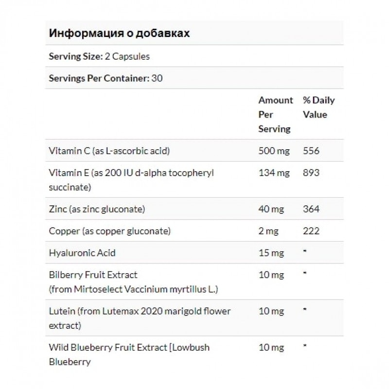 Наши глаза постоянно подвергаются стрессу, от излучения экранов различных гаджетов. Для поддержания зрения и здоровья глаз необходима поддержка с помощью витамин, минералов и органических растительных экстрактов. В составе экстракты черники и календулы. Зеаксантин и лютеин (из календулы) являются каротиноидами, то есть растительными пигментами, которые сконцентрированы в сетчатке глаза. Оба эти вещества необходимы для поглощения лишней энергии света, поскольку она может быть крайне опасна, особенно из высокоэнергетических лучей, называемых синим или ультрафиолетовым светом. Также, благодаря своим антиоксидантным свойствам, эти пигменты защищают хрусталик глаза от окислительного стресса. Это значит, что зеаксантин и лютеин поддерживают остроту зрения. Окисление хрусталика также является одной из основных причин катаракты.