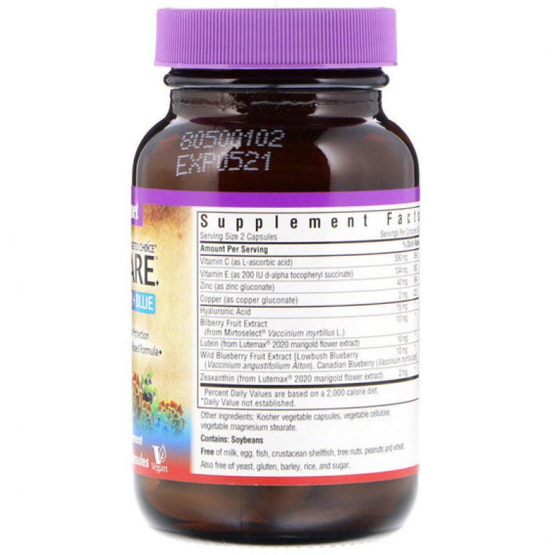Комплекс для глаз Bluebonnet Targeted Choice содержит гиалуроновую кислоту и суперфрукты, предотвращает возрастные заболевания глаз и снижает негативное воздействие синего излучения экранов.