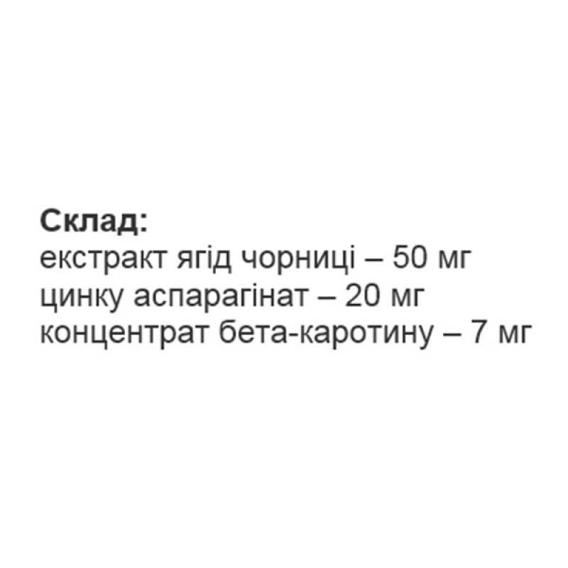 Компоненты комплекса обладают антиоксидантными, противовоспалительными, капилля-укрепляющими свойствами и улучшают микроциркуляцию глаза. Высокая активность препарата обусловлена наличием в составе наиболее значимых для зрения витаминов и минералов, обогащенных экстрактом ягод черники с высоким содержанием антоцианов.