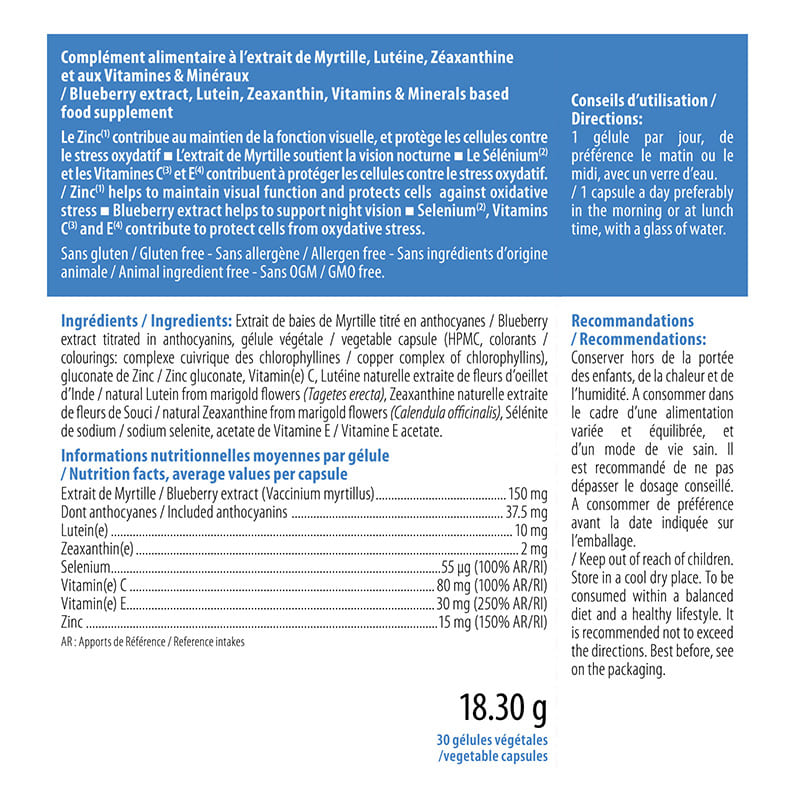 • Экстракт черники (Vaccinium myrtillus) 150 мг, в т.ч. антоцианозиды 37,5 мг: Результаты тестов, проведенных после Второй мировой войны, подтвердили утверждения пилотов британских ВВС, что черничное варенье улучшает ночное зрение и ускоряет восстановление при ослеплении. Кроме того, антиоксидантные антоцианозиды способствуют защите сосудов, которая предотвращает или замедляет прогрессирование дегенеративных заболеваний глаз (макулодистрофия, катаракта, диабетическая ретинопатия).