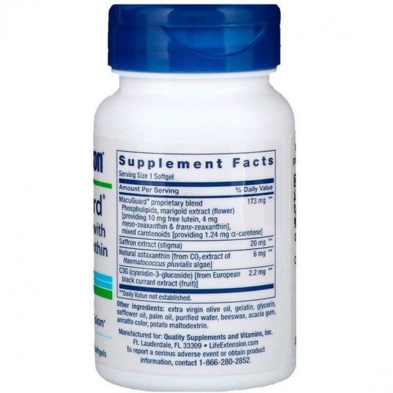 Здоровье глаз с шафраном и астаксантином (MacuGuard Ocular Support with Saffron Astaxanthin) от Life Extension - в состав этого продукта входит лютеин, транс-зеаксантин, мезо-зеаксантин. Именно эти три питательные вещества помогут защитить клетки фоторецепторов в сетчатке глаза от легких повреждений. Кроме того, эта инновационная формула содержит астаксантин, который защищает от усталости глаз, и цианидин-3-глюкозид (соединение ягодных флавоноидов), который поглощает свет в сетчатке, чем помогает поддержать зрение ночью. Многочисленными исследованиями было доказано, что прием астаксантина в сочетании другими каротиноидами, помогает повысить остроту зрения и поддерживать здоровье внутриглазных сосудов. Астаксантин также убирает усталость глаз, снижает чувство мутности, раздражения и положительно влияет на здоровье глаз в целом. Также в состав этой пищевой добавки входит альфа-каротин, который нормализует плотность макулярного пигмента, и экстракт шафрана, который улучшает зрение. Употребление этой пищевой добавки однозначно убережет и защитит ваши глаза, продлит им молодость.