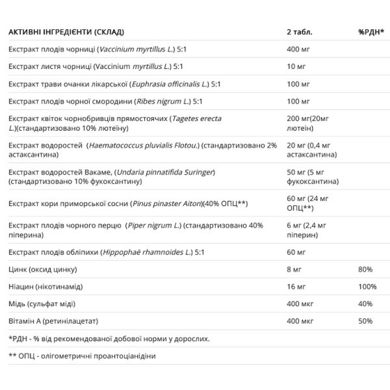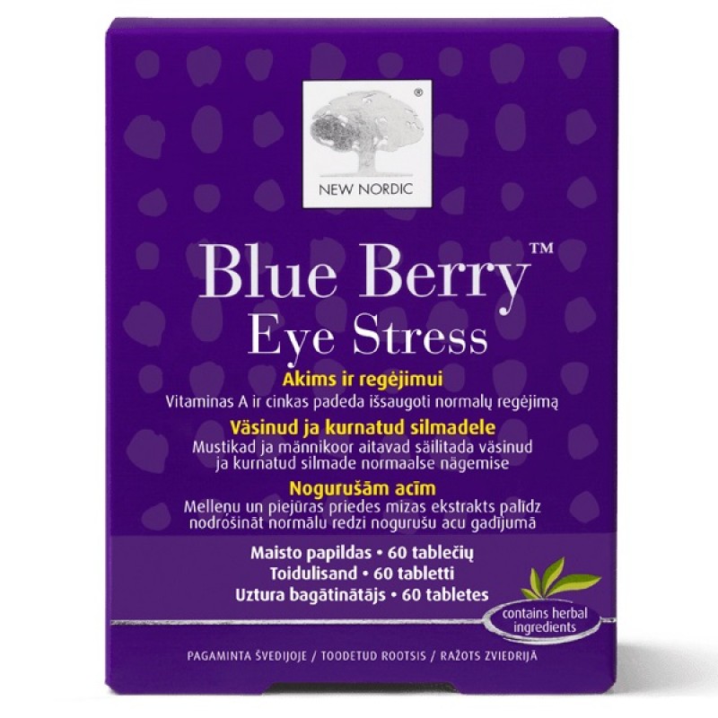 Таблетка создана на основе натуральных экстрактов черники и облепихи в сочетании с корой французской приморской сосны, черной смородиной и бархатцами, богатыми лютеином. Кроме того, Blue Berry™ Eye Stress содержит комбинацию натурального астаксантина, зеаксантина и фукоксантина, а также витамина А, ниацина, цинка и меди. Черника и сосновая кора снимают усталость и напряжение глаз. Черника помогает поддерживать здоровье глаз. Витамин А и цинк способствуют нормальному зрению. Ниацин помогает поддерживать нормальное состояние слизистых оболочек.