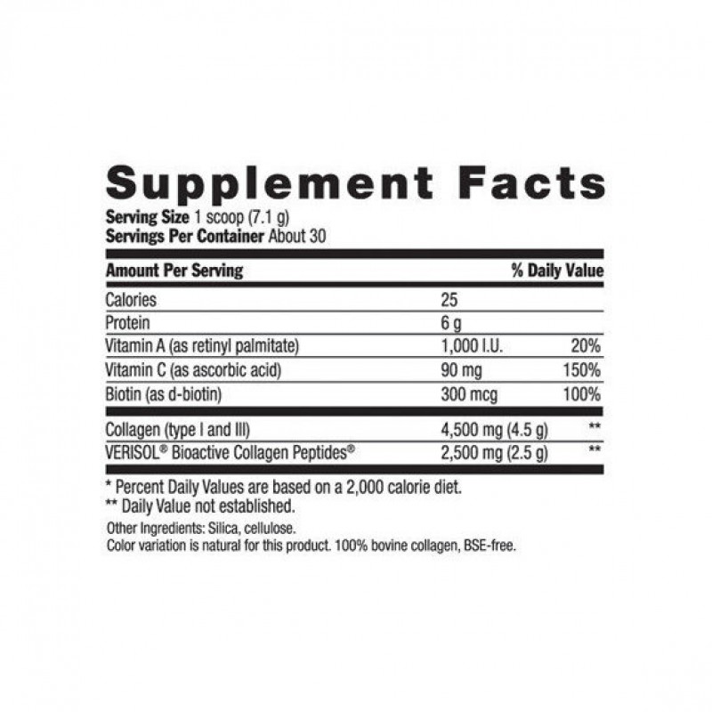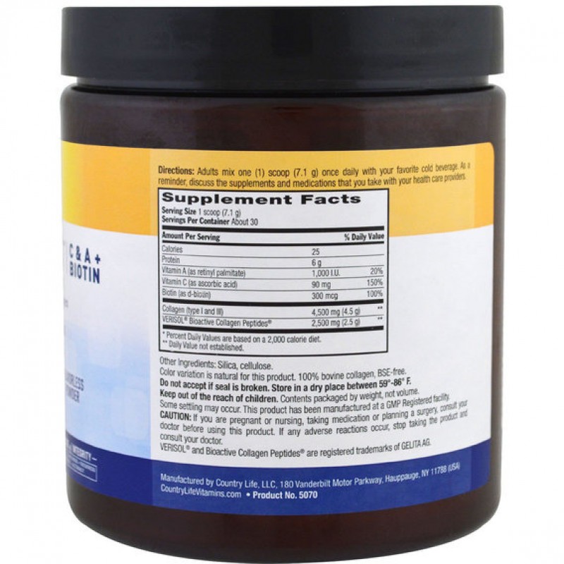 Коллаген макси и витамины А, С плюс биотин, Maxi-Collagen, C and A plus Biotin, Country Life - это продукт, который обеспечивает красоту кожи, волос, ногтей и здоровье костей и суставов. 7000 мг коллагена типа I и III, в том числе клинически испытанного Verisol коллагена, способствует повышению эластичности кожи, уменьшению глубины морщин, здоровью волос, ногтей, суставов и костей, увеличению коллагена в организме на 60%.