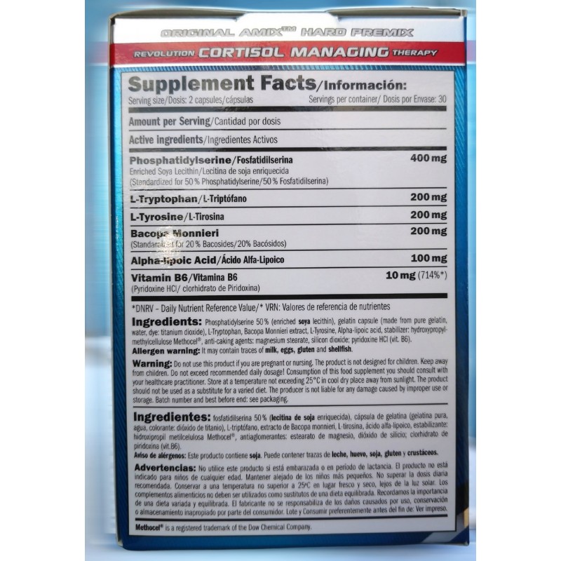 Amix Cortisol Blocker основан на экстракте бакопы моньери и фосфолипида фосфатидилсерина. Бакопа положительно влияет на центральную систему мозга. Продукт богат L-триптофаном, L-тирозином, витамином B6 и альфа-липоевой кислотой. Эта комбинация ингредиентов улучшает функцию нервной системы, метаболизм белков и гликогена, способствует правильной гормональной активности и снижает утомляемость.