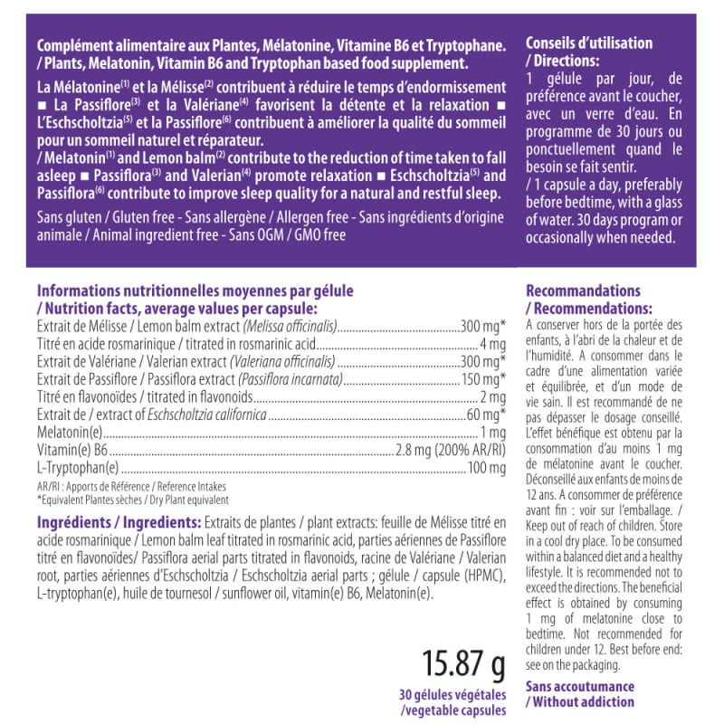 Ингредиенты: Патентованный экстракт мелиссы титрованный в гидроксикоричную и розмариновую кислоты – Cyracos®, вегетарианская капсула (HPMC, краситель: медный комплекс хлорофиллинов), экстракт корней шлемника титрованный в байкалин, экстракт цветов страстоцвета титрованный во флавоноиды (основа: мальтодекстрин), L -триптофан, морской магний, пудра верхушек цветов эшшольции, экстракт цветов мака, L-теанин, эмульгатор: стеарат магния, анти-связующий агент: диоксид кремния, витамин B6, мелатонин.