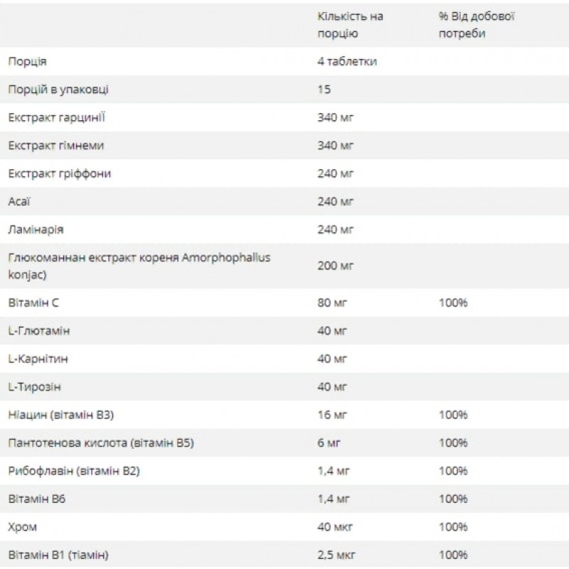 Гарциния снижает аппетит, подавляет синтез жирных кислот и холестерина, и уменьшает накопление жира в жировой ткани. Гимнема уменьшая всасывание глюкозы в кишечнике, а гриффония стимулирует выработку серотонина, уменьшая тягу к еде, тягу к сахару и способствуя снижению веса. Хром мобилизирует жировые запасы и способствовать их катаболизму. Тирозин уравновешивает метаболизм, способствуя снижению веса, стимулирует обмен веществ и устранение жира. Водоросли ламинарии богатые йодом, они способствуют правильной функции щитовидной железы, улучшая обмен веществ и способствуя снижению веса.