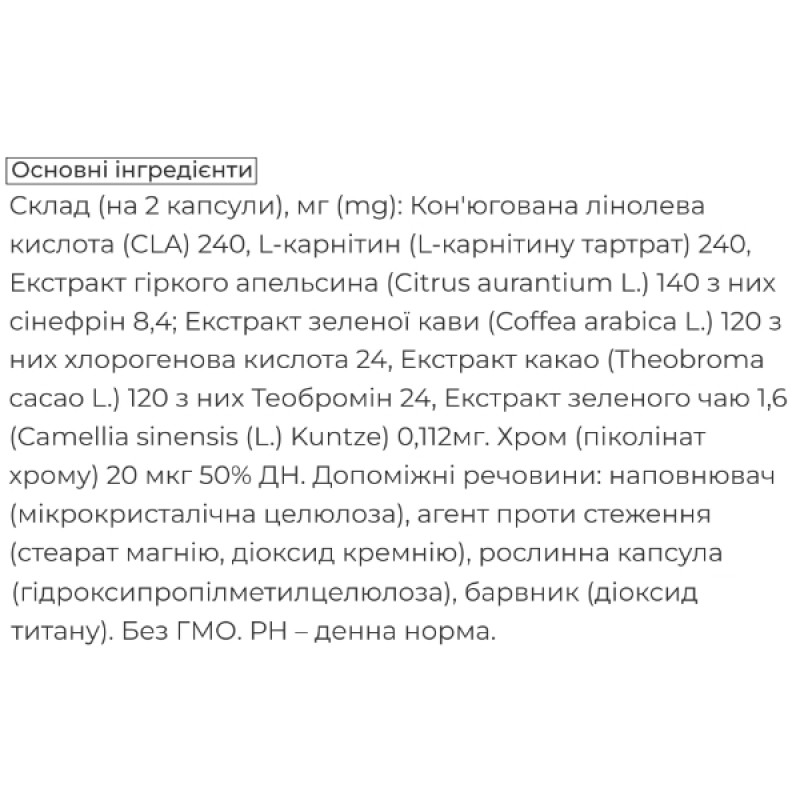 Metabol SIMILDIET - действие конъюгированной линолевой кислоты заключается в сжигании жира и одновременно тонизирует мышечную ткань. Так как в мышцах сгорает для образования энергии большая часть жира, то получается, что конъюгированная линолевая кислота уменьшает жировую массу двумя путями – непосредственно уменьшая жировые запасы и опосредованно – увеличивая объем мышц. L-карнитин улучшает транспорт жиров и их окисление в митохондриях. Хлорогеновая кислота, компонент зеленого кофе, мощный антиоксидант, защита клеток от свободных радикалов. Экстракт зеленого чая - эффективное тонизирующее, противовоспалительное средство, которое нормализирует обмен веществ. Способствует снижению веса и повышению жизненного тонуса. Пиколинат хрома повышает утилизацию углеводов (усиливает превращение глюкозы в гликоген); стимулирует липолиз; нормализует обмен веществ.