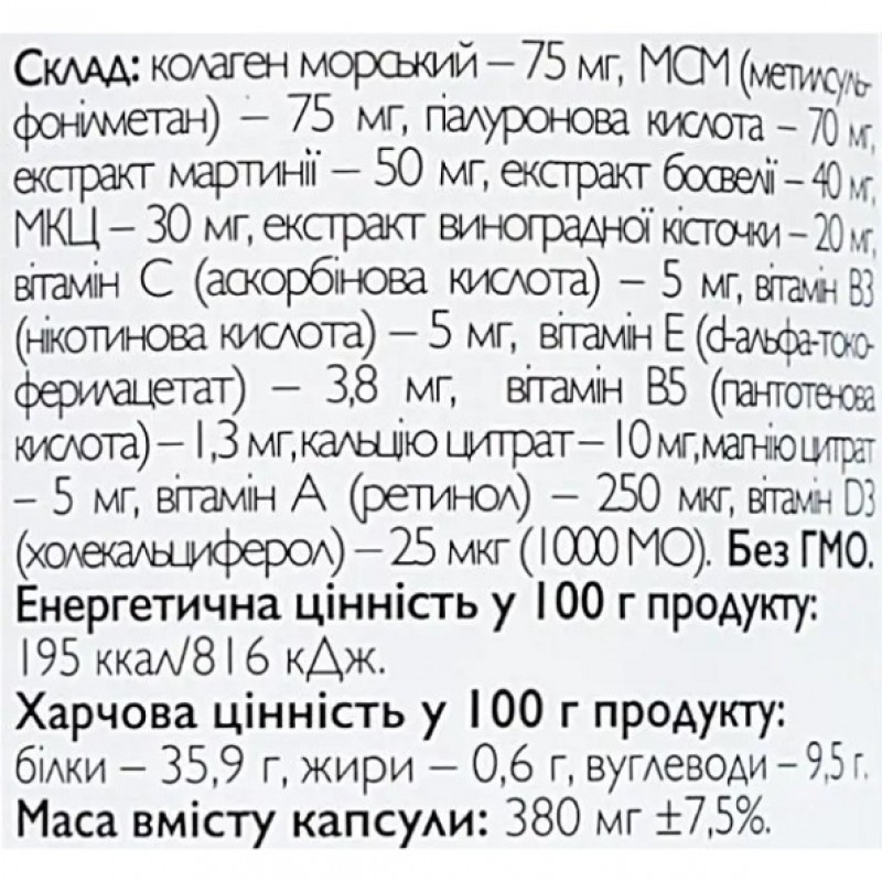 Комплекс All be Ukraine Condroprotector & Collagen - это комплексный препарат, содержащий целый ряд активных ингредиентов, предназначенных для поддержания здоровья суставов и кожи. Морской коллаген, гиалуроновая кислота, экстракт мартинии, экстракт босвелии и другие компоненты помогают укрепить соединительную ткань, повысить ее эластичность и улучшить кровообращение в тканях. Морской коллаген, содержащийся в Condroprotector&Collagen, получают из кожи морских рыб, которые не используются в пищу, что делает его использование экологически чистым и безопасным для человека.