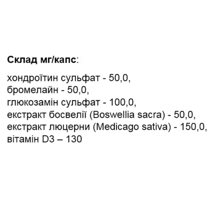 Хондроитин – увеличивает эффект смазки внутри суставов и может подавлять (угнетать) действие ферментов, разрушающих хрящевые ткани. Бромелайн оказывает противовоспалительное действие, благотворно действуя на суставы.