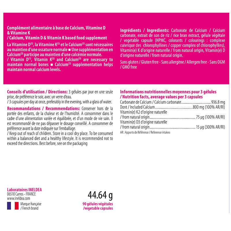 Ингредиенты: Карбонат кальция, растительная капсула (HPMC, краситель: медный комплекс хлорофиллинов), витамин К натурального происхождения, Витамин D натурального происхождения.
