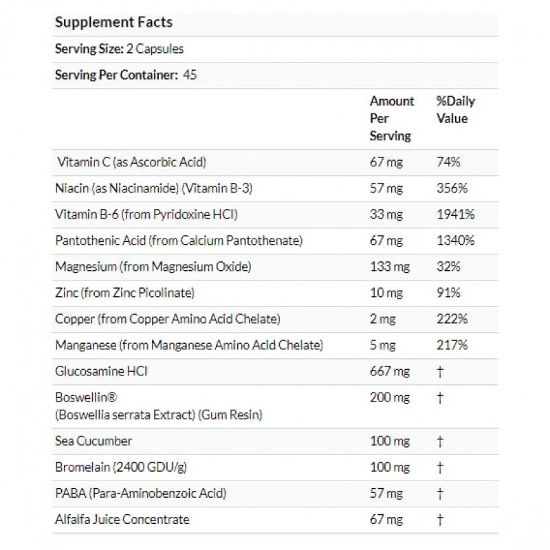 Joint Support™ — это комбинация питательных веществ и других ингредиентов, которые поддерживают формирование и функционирование здоровых тканей суставов. Joint Support™ содержит витамин С, марганец и медь, которые крайне важны для производства и поддержки здоровых структур суставов. Также включает цинк, витамины группы В и Boswellin®, которые поддерживают правильную реакцию организма на ежедневную нагрузку на суставы. Глюкозамин включен в качестве основного структурного компонента, который естественным образом содержится в костях и суставах.