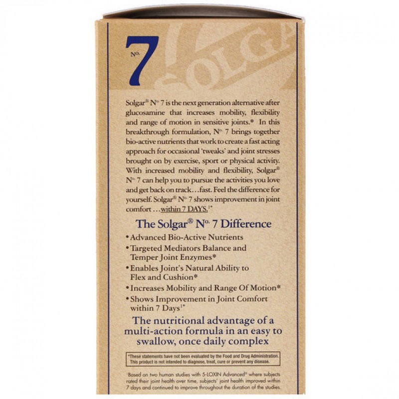 Solgar N°7 — альтернатива следующего поколения глюкозамину, увеличивает подвижность, гибкость и амплитуду движения чувствительных суставов. В этой передовой формуле N° 7 содержатся биоактивные вещества, защищающие суставы от напряжения и повреждения, связанных с упражнениями, занятиями спортом и другой физической активностью. Повышая подвижность и гибкость, Solgar N° 7 помогает заниматься любимыми упражнениями и быстро вернуться обратно на спортивный трек. Испытайте, чтобы увидеть разницу. Всего за 7 дней Solgar N° 7 возвращает суставам ощущение комфорта.