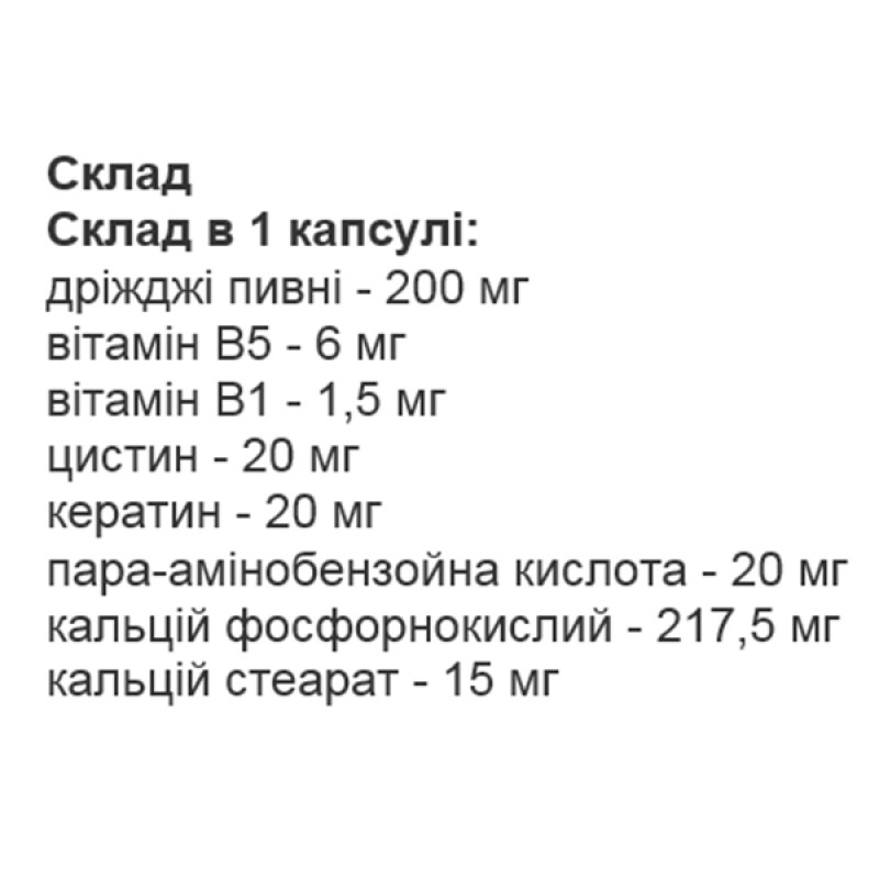 В состав PANTOhair входят дрожжи, пантотеновая кислота (Витамин В5), тиамин (Витамин В1) нитрат, цистин, кератин и 4-аминобензойная кислота, которые необходимы для поддержания оптимальной регуляции обмена веществ в организме.
