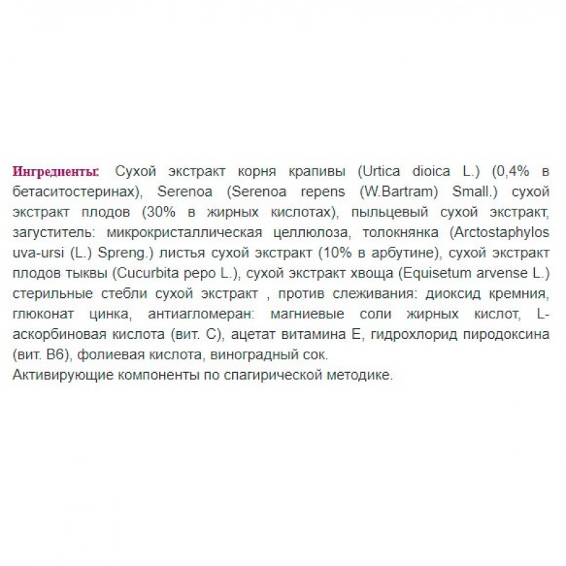 ProstVin включает в себя экстракты таких лекарственных растений, как листья сереноа и корень крапивы, которые показали свою значимость для здоровья простаты. Одним из самых важных растительных компонентов в составе является экстракт шведской цветочной пыльцы. Этот компонент способствует здоровому потоку мочи и помогает поддерживать правильную функцию клеток предстательной железы. Также препарат содержит витамины Е и B6, фолат и цинк, которые играют важную роль не только в поддержке здоровья простаты, но и положительно действуют на общее самочувствие.