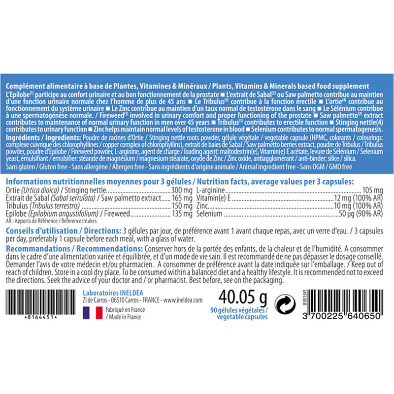 Ингредиенты: Пудра корней крапивы, растительная капсула (HPMC, краситель: медный комплекс хлорофилинов), экстракт ягод сабаля, пудра трибулуса, пудра кипрея узколистного, L-аргинин, основа: мальтодекстрин, витамин Е ацетат, дрожжевой селен, эмульгатор: стеарат магния, оксид цинка.