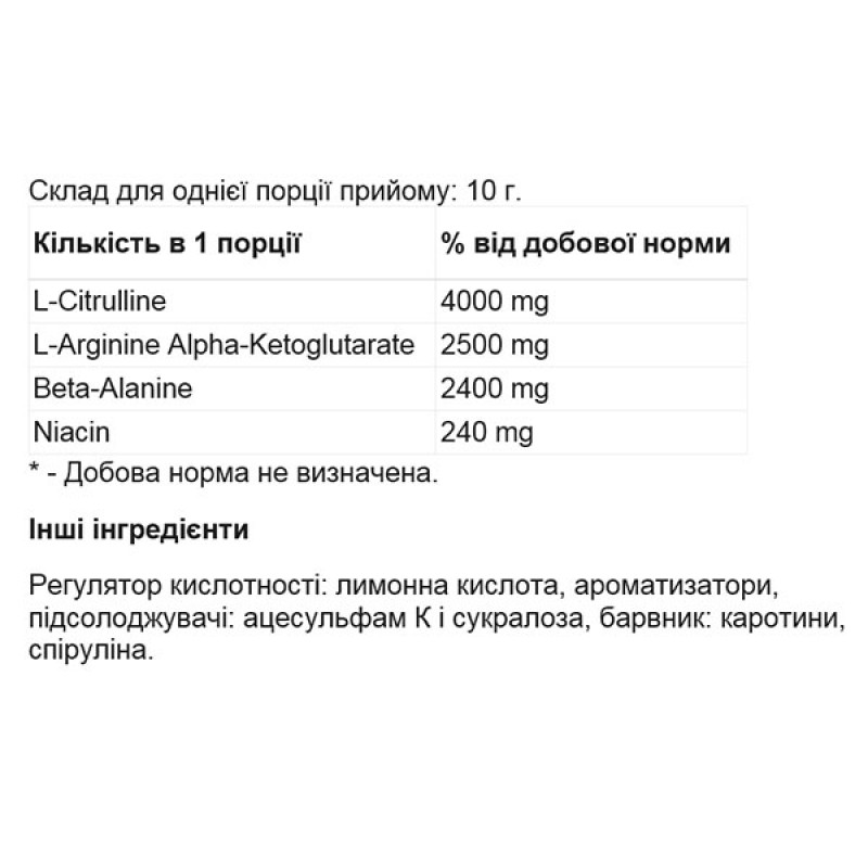 Ежедневная порция этой добавки содержит 4000 мг L-цитрулина, способствуя расширению сосудов и улучшению кровообращения, 2500 мг L-аргинина альфа-кетоглютарата для поддержания выносливости, 2400 мг бета-аланина для задержки усталости мышц и 240 мг. Эти ингредиенты совместно способствуют повышению эффективности тренировок и усиливают ощущение пампа для оптимального питания мышц, а отсутствие кофеина делает этот комплекс идеальным выбором для ищущих эффективное средство для повышения энергии без стимулирующего воздействия.