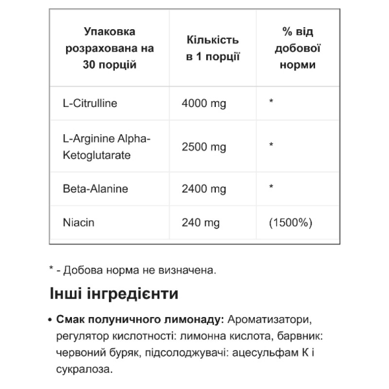 Ежедневная порция этой добавки содержит 4000 мг L-цитрулина, способствуя расширению сосудов и улучшению кровообращения, 2500 мг L-аргинина альфа-кетоглутарата для поддержания выносливости, 2400 мг бета-аланина для задержки усталости мышц и 240 мг Ниацина чтобы поддержать энергетический обмен и здоровье нервной системы. Эти ингредиенты совместно способствуют повышению эффективности тренировок и усиливают ощущение пампа для оптимального питания мышц, а отсутствие кофеина делает этот комплекс идеальным выбором для тех кто ищет эффективное средство для повышения энергии без стимулирующего воздействия.
