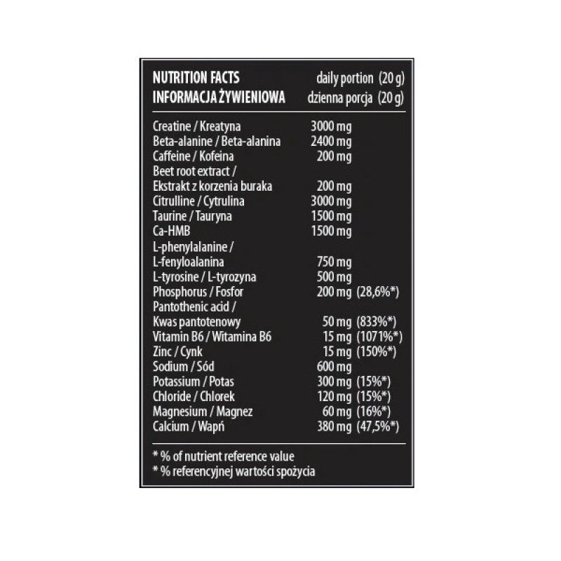 Препарат содержит аминокислоты, витамины и минералы. Потребление креатина повышает физическую работоспособность во время кратковременных, повторяющихся, высокоинтенсивных упражнений. Бета-аланин за счет задержки наступления утомления позволяет продлить время тренировки. Кофеин помогает повысить выносливость и физическую работоспособность во время тренировки. Пантотеновая кислота помогает поддерживать умственную работоспособность на должном уровне.