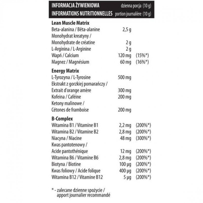 Принимайте по 1 порции (2 чайные ложки – 10 г) 1 раз в день. Оптимальное время приема – за 20-30 мин до начала тренировки. Каждая порция смешивается с 200 мл воды.