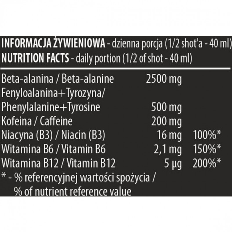 Дозировка: половина пакета (1/2 shota- 40 мл) пить перед тренировкой. Перед употреблением хорошо взболтать.