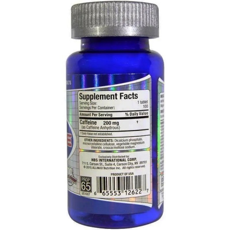 Allmax Caffeine быстро и полностью всасывается в желудочно-кишечном тракте и достигает мозга через 5 минут после приема. Максимальная концентрация кофеина в крови человека наблюдается приблизительно через 45-50 минут после приема. Важно отметить, что таблетированная (безводная) форма продукта, в которой находится Allmax Caffeine, считается самой стабильной и удобной.