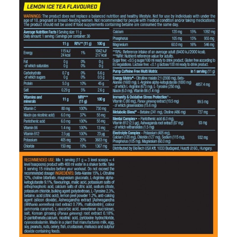 Cодержит ниацин и витамин B6, что способствует нормальному метаболизму энергии и снижению усталости и утомления. Продукт содержит условно незаменимые аминокислоты L-тирозин и L-аргинин. Кроме того, AAKG (альфа-кетоглутарат аргинина) содержит аргинин. Основным ингредиентом матрицы является соединение цитруллин-малат (2:1). Естественно, формула не может быть полной без бета-аланина, который является предшественником карнозина, что делает его еще одним ключевым ингредиентом предтренировочных смесей.