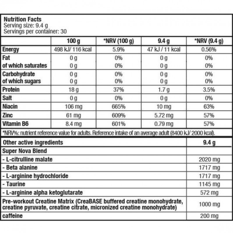 Super Nova — комплекс полезных веществ, способствующих увеличению производительности организма. Уникальность этого препарата заключается в том, что в его составе нет углеводов. Принимая его, спортсмены и люди, подвергающиеся большим физическим нагрузкам, могут повышать свой силовой потенциал, не накапливая лишних калорий.