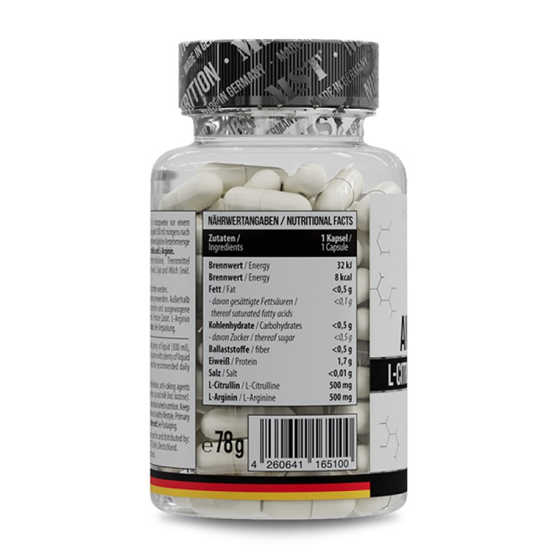 Предтренировочный комплекс содержит только два основных ингредиента: Аргинин и Цитрулин.