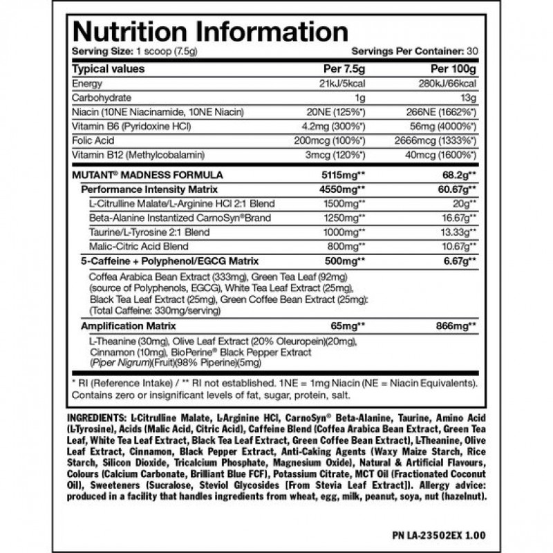 MUTANT MADNESS - источник энергии, направленный на улучшение Ваших спортивных достижений. Разнообразие вкусов так же является одним из преимуществ комплекса: 6 абсолютно уникальных вкусов усилят удовольствие от этого предтрена.
