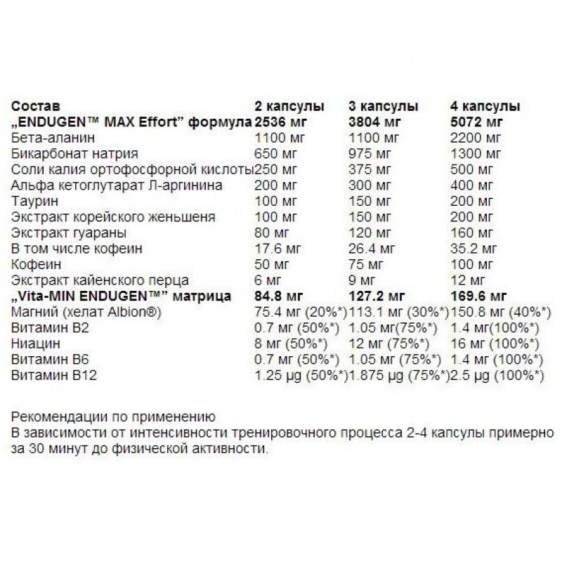 Рекомендации по применению: В зависимости от интенсивности тренировочного процесса 2-4 капсулы примерно за 30 минут до физической активности.