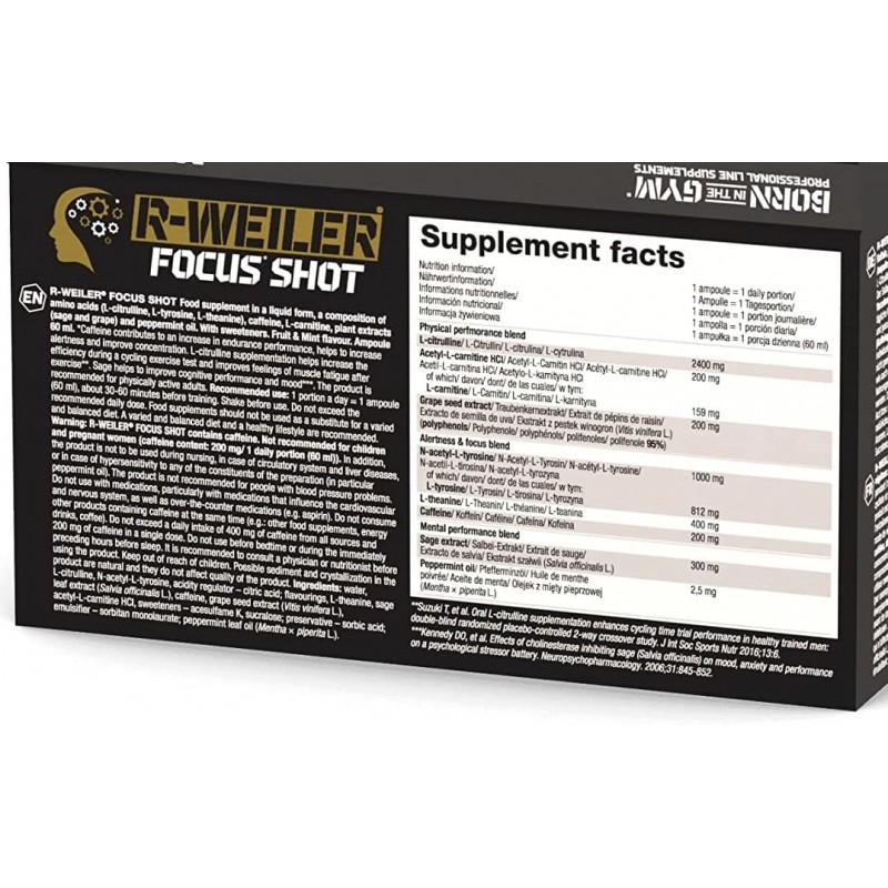 Концепция сочетания предтренировочной добавки с все более популярными ноотропами - новинка на рынке пищевых добавок! В состав Olimp R-WEILER ® Focu входят две высококачественные смеси, дополненные твердой частью таурина и бета-аланина. Здесь у нас есть ингредиенты, которые благотворно влияют на:
