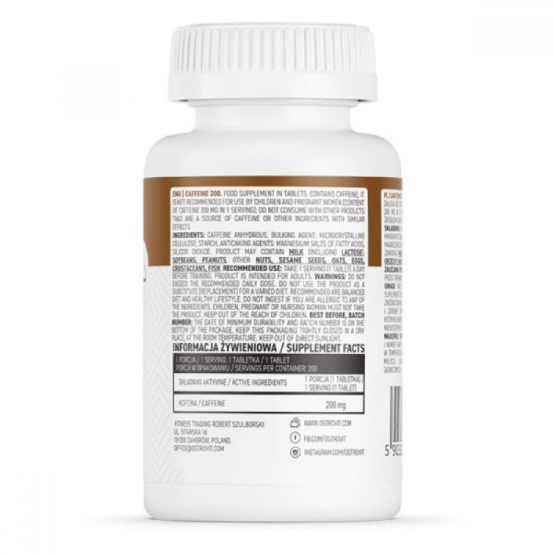 Caffeine 200 от компании OstroVit – высококачественная пищевая добавка для увеличения выносливости в повседневной жизни. Продукт был создан специально для людей, которым необходима стимуляция ЦНС на непродолжительный период. Препарат особенно рекомендуется для спортсменов, водителей и людей, которые нуждаются в дополнительной "инъекции" возбуждения во время учебы или работы, помогая повысить бдительность, работоспособность, умственную и физическую активность. Кофеин является энергетическим акселератором, обладает выраженным стимулирующим действием, что позволяет повысить интенсивность тренировок, ускорить сжигание запасов жира.