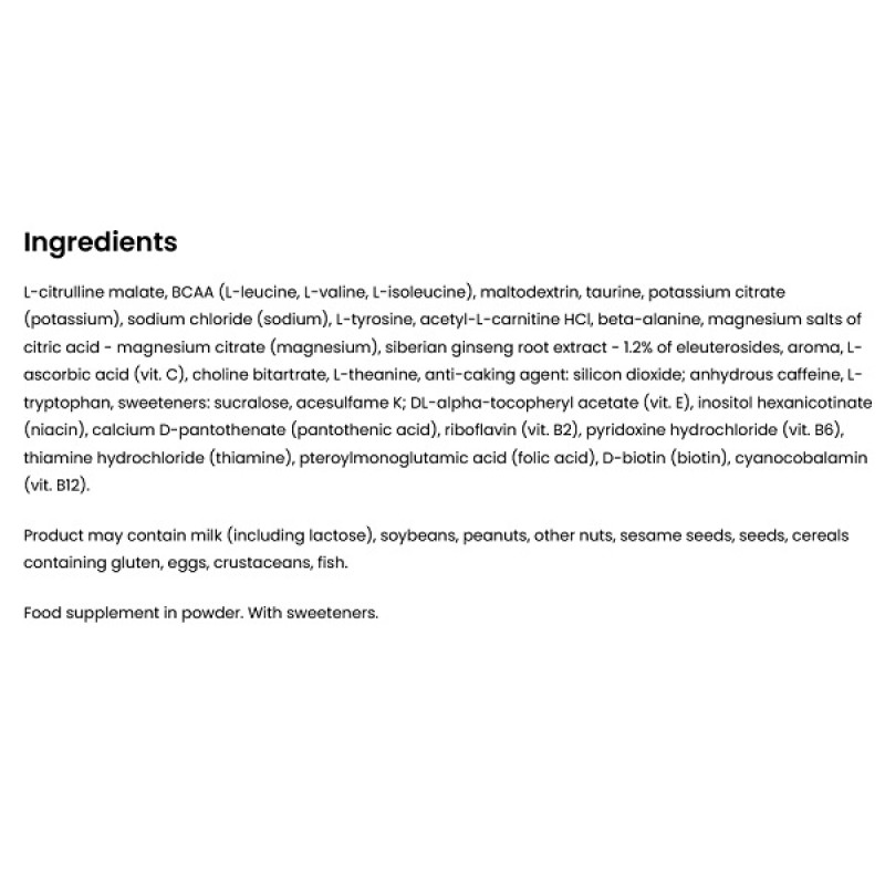 Цитруллин малат - усиливает эффект тренировочного насоса. Ускоряет оксигенацию клеток организма и процесс регенерации после физических упражнений. Это уменьшает усталость и воспаление.