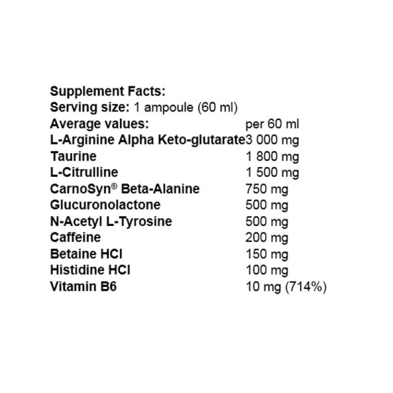 - Мощный пампинг благодаря дозе аргинина ААКГ (3000 мг) и цитруллина малата (1500 мг).