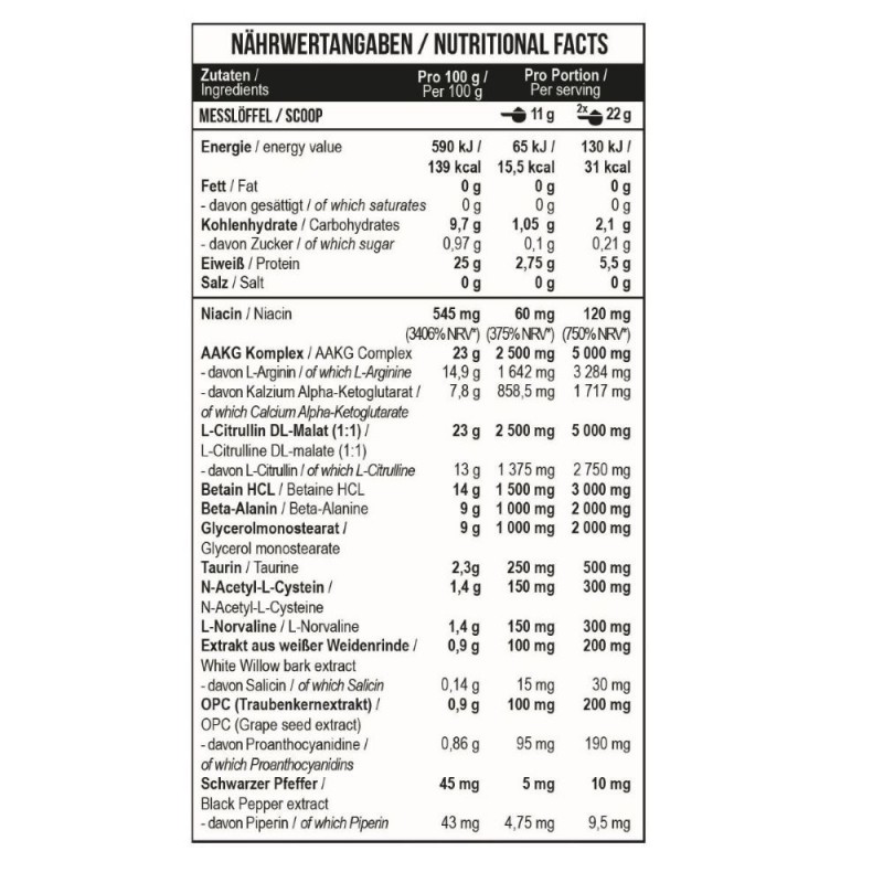 Состав усилен экстрактом виноградных косточек, экстрактом коры белой ивы, экстрактом черного перца, что повышает выносливость, снижает утомляемость, способствует ускорению роста мышечной массы.