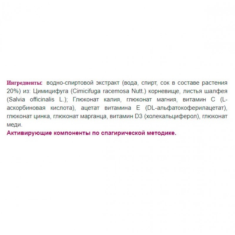 Показания к применению: Принимать 20-30 капель 2 раза в день, разбавляя небольшим количеством воды, предпочтительно в первой половине дня. Взболтать перед употреблением.