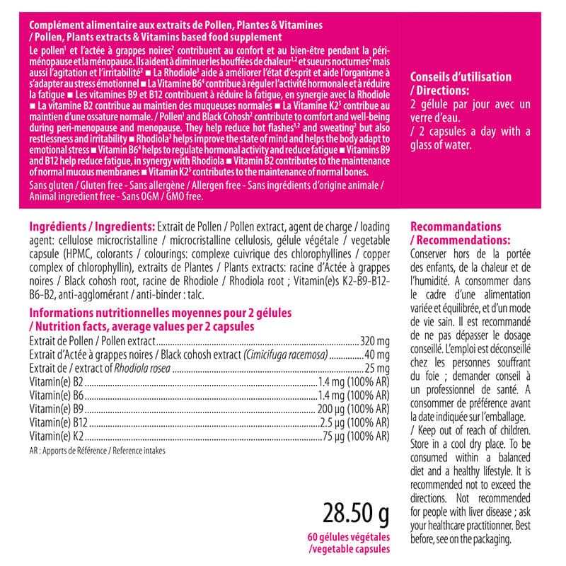 Пыльца и черный кохош способствуют комфорту и благополучию во время пременопаузы и менопаузы. Они помогают уменьшить приливы и ночную потливость, а также беспокойство и раздражительность.
