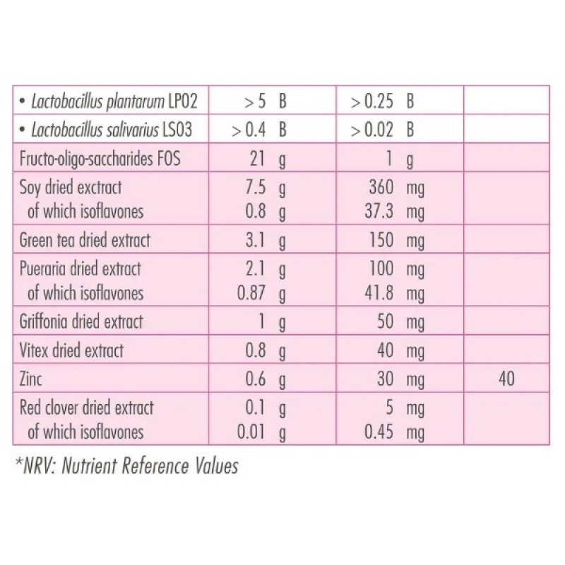 Уникальное мультифункциональное средство исключительно натуральных веществ. Эксклюзивная комбинация из 8 активных растительных ингредиентов (3 из них изофлавоны), для благополучия кишечника 7 штаммов молочнокислых бактерий, клетчатка FOS (фруктоолигосахариды), а также биодоступный цинк. Без ГМО и лактозы.