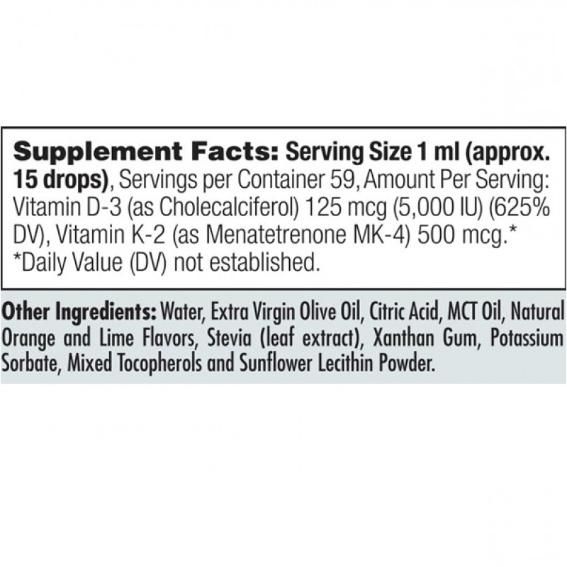 KAL D-3 K-2 DropIns — жидкая эмульсия со вкусом натурального цитруса. Просто капли в рот. Порция 1 мл составляет примерно 15 капель или содержимое полной пипетки.